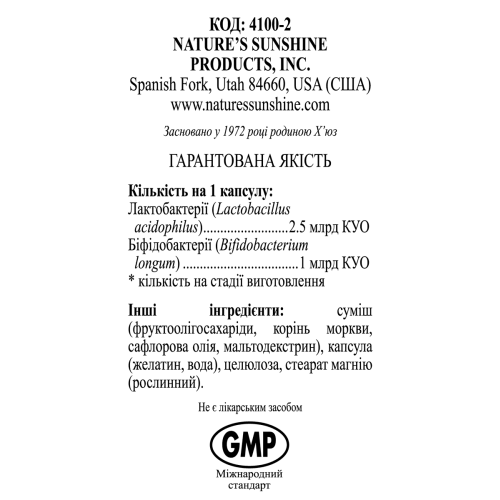 Состав - 1 капсула: лактобактерии (Lactobacillus acidophilus) - 25 x 108 КОЕ*; бифидобактерии (Bifidobacterium longum) - 10 x 108 КОЕ*; Фруктоолигосахариды, порошок моркови, мальтодекстрин, масло сафлоры - 470 мг.