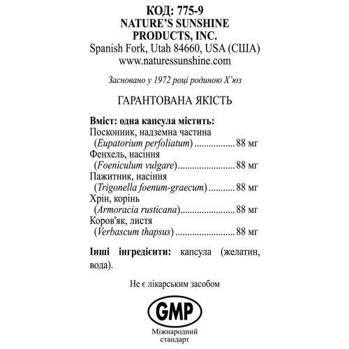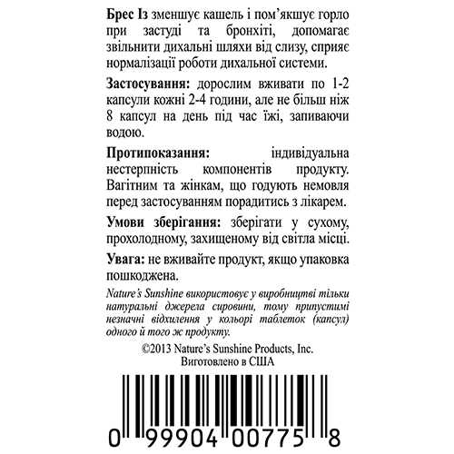 Состав - 1 капсула: корень хрена (Armoracia rusticana) - 88 мг; листья коровяка обыкновенного (Verbascum thapsus) - 88 мг; семена пажитника (Trigonella foenum-graecum) - 88 мг; семена фенхеля (Foenсiculum vulgare) - 88 мг; трава посконника (Eupatorium perfoliatum) - 88 мг.
