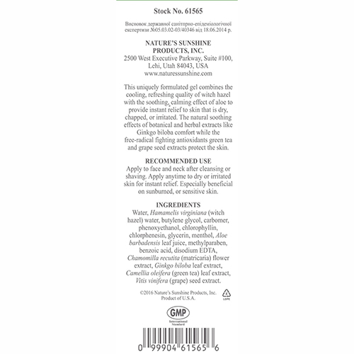 Состав: Вода, этанол, бутиленгликоль, глицерин, полиэтиленгликоль-40, гидрогенизированное касторовое масло, отдушка, карбомер, тетранатрий ЕДТУ, гидроксид натрия, сок листьев барбадосского алоэ, экстракт цветков ромашки аптечной, экстракт листьев розмарина, экстракт листьев камелии китайской.