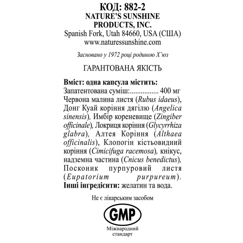 Состав - 1 капсула: листья малины красной (Rubus idaeus) - 79 мг; корень Донг Ква (Angelica sinensis) - 71 мг; корень имбиря лекарственного (Zingiber officinale) - 53 мг; корень солодки голой (Glycyrrhiza glabra) - 53 мг; корень клопогона кистевидного (Cimicifuga racemosa) - 36 мг; надземные части кникуса благословенного (Cnicus benedictus) - 36 мг; корень алтея лекарственного (Althaea officinalis) - 36 мг; листья посконника пурпурного (Eupatorium purpureum) - 36 мг.