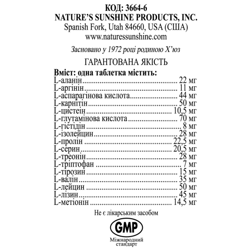 Состав - 1 таблетка: гидролизат белка молочной сыворотки - 533 мг; L-валин - 13 мг; L-фенилаланин - 13 мг; L-изолейцин - 6,5 мг; L-лизин - 5,0 мг; L-метионин - 5,0 мг; L-треонин - 4,0 мг; L-лейцин -1,5 мг; магний (аспартат, оксид) - 56,2 мг (14,1% от АСП); L-карнитин - 49,6 мг (16,5% от АСП).