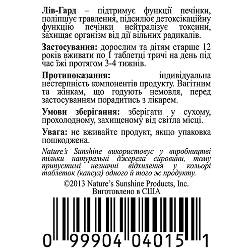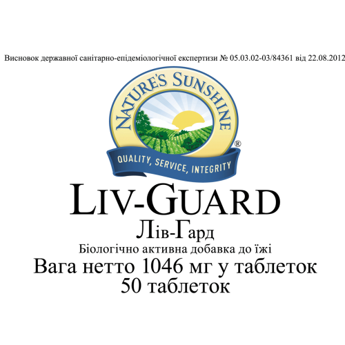 Liv-Guard содержит экстракты двух лекарственных растений: расторопши пятнистой и одуванчика, а также в-каротин и витамин С, которые обладают антиоксидантными свойствами и защищают клетки печени от действия токсических веществ, в состав входят также холин и инозитол, препятствующие жировой инфильтрации печени.