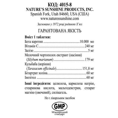 beta-каротин - 10.000 МЕ. Витамин С - 240 мг. Железо - 5 мг. Расторопша пятнистая (Silybum marianum) (стандартизирована - 80% силимарина) - 179 мг. Корень одуванчика (Taroxacum officinale) - 152 мг. Холин (битартат) - 60 мг. Инозитол - 60 мг.