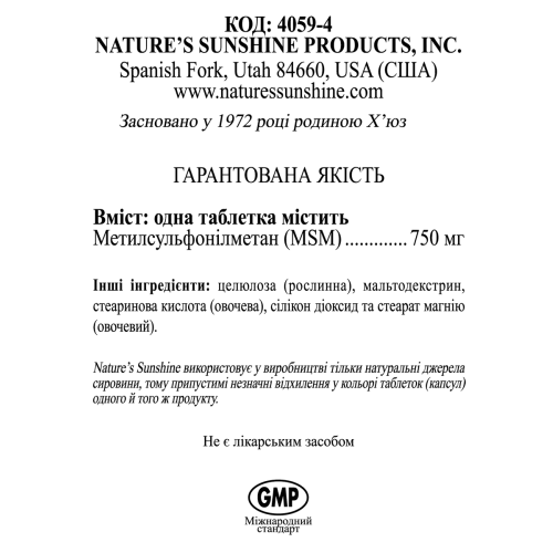 Состав - 1 таблетка: метилсульфонилметан - 750 мг (255 мг серы в органической форме).