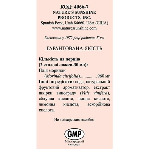 Состав (2 столовые ложки – 30 мл): фруктовый концентрат (груша, виноград) - 3,81 г; порошок плодов Нони (Morinda citrifolia) - 983 мг; экстракт из кожицы красного винограда (Vitus vinifera) - 63 мг; витамин С - 5,2 мг (5,7% от АСП).