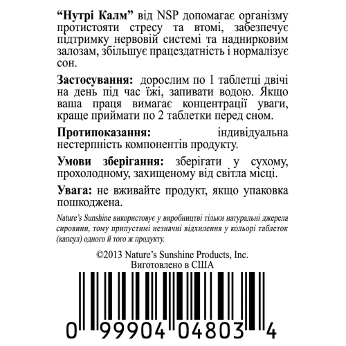 В состав Nutri-Calm входят витамины группы В, антиоксиданты (витамин С и Е, биофлавоноиды, зародыши пшеницы), которые нейтрализуют действие свободных радикалов и защищают иммунную систему, а также лекарственные растения и вещества растительного происхождения: лимонник китайский, цветочная пыльца, валериана, страстоцвет, шишки хмеля, холин, инозит, Парааминобензойная кислота, которые оказывают успокаивающее действие на организм, помогая справиться со стрессом, поддерживают жизненные силы, повышают выносливость и работоспособность.