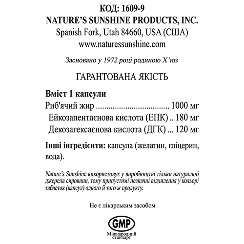 Состав - 1 капсула: жир пищевой из рыбы - 1208 мг; эйкозапентаеновая кислота (ЭПК) - 180 мг (30%); декозагексаеновой кислоты (ДГК) - 120 мг (17% от АСП); витамин Е (d-alfa- tocoferol) - 1 ME (1 мг) (6,7% от АСП)