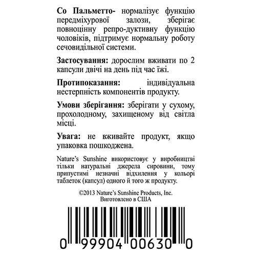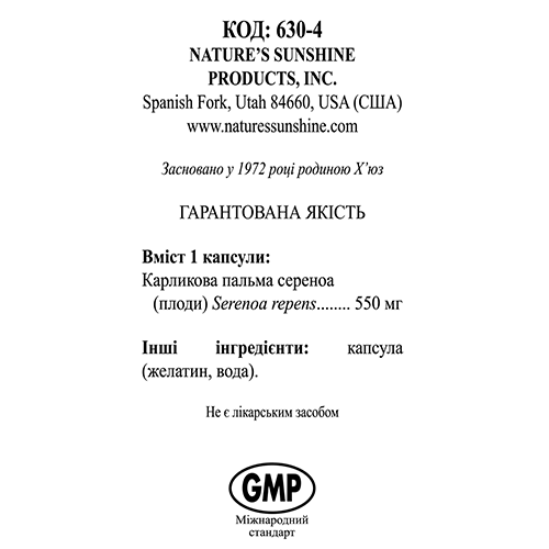 Состав - 1 капсула: плоды сереноа ползучей (Serenoa repens) - 550 мг. Вспомогательные вещества: желатин.