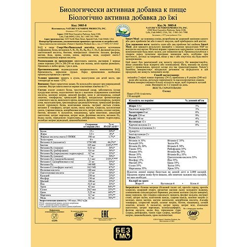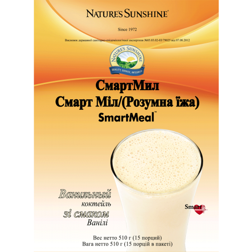 СмартМил / Ванильный коктейль содержит белок, витамины: А, В1, В2, В6, В12, С, D3, Е, фолиевую кислоту, ниацин, пантотеновую кислоту, биотин, биоэлементы: кальций, магний, фосфор, хром, селен, медь, марганец, цинк, йод, калий, которые находятся в хелатной форме, щ-3 ПНЖК, линолевую и г-линоленовую щ-6 ПНЖК. Одна порция коктейля (34 г) содержит 15 грамм белка, 3,5 г жира, 15 г углеводов, 1,18 г - щ-6 ПНЖК и 219 мг - щ-3 ПНЖК. Энергетическая ценность одной порции – 130 ккал. В состав комплекса также входят: среднецепочечные жирные кислоты, лецитин, гуаровая и ксантановая камеди (растворимые в воде некрахмалистые полисахариды).