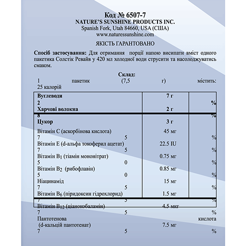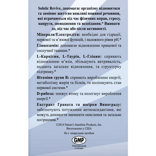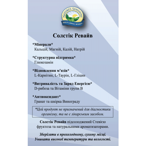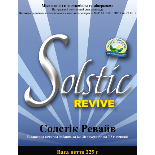 БАД к пище Солстик Ревайв является дополнительным источником глюкозамина, инулина, D-рибозы, витаминов Е, С, B1, B2, B6, B12, PP, пантотеновой кислоты, содержитстевиозиды.