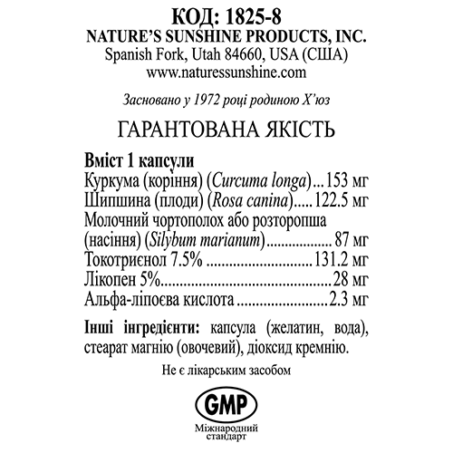 Состав - 1 капсула: корень куркумы (Curcuma longa) - 153,0 мг; смесь токотриенолов - 131,2 мг (5 мг витамина Е – 33% от АСП); плоды шиповника (Rosa canina) - 122,5 мг; семена молочного чертополоха (Silybum marianum) - 87,0 мг; альфа-липоевая кислота - 2,3 мг (7,7% от АСП); ликопин - 1,4 мг (28% от АСП)