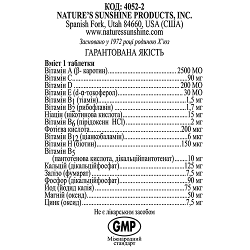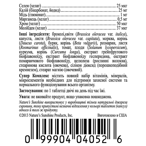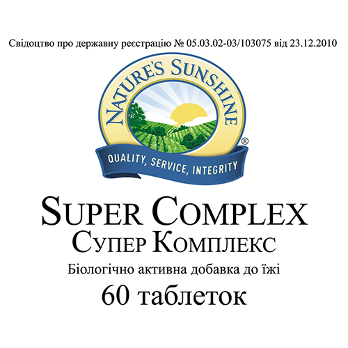 Супер Комплекс содержит 11 витаминов, в-каротин и 12 наиболее важных биоэлементов, необходимых для нормальной работы организма. Витамины и биоэлементы находятся в легкоусваиваемой форме. Супер Комплекс содержит цитрусовые биофлавоноиды, гесперидин, атакже порошок брокколи, куркумы, свеклы, розмарина, свеклы, томатов, моркови, капусты.