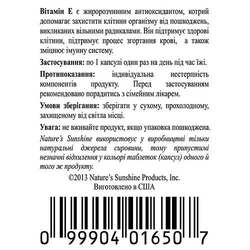 Состав - 1 капсула: витамин Е (d-альфа-токоферол) - 100 ME (100 мг - 111% от АСП).